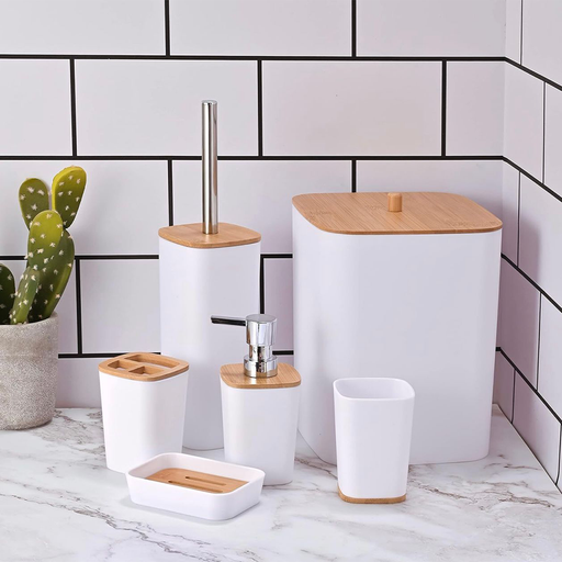 Ordine e Stile per il Tuo Bagno: Accessori Coordinati in Nero e Legno Dona un tocco moderno e ordinato al tuo bagno con questo set completo di acce...
