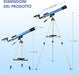 - Tipo: Telescopio rifrattore;Lunghezza focale: 600 mm (f/12);Diametro apertura: 50 mm;Oculari inclusi: 25 mm (48x) e 12,5 mm (30x);Mirino: Red dot 5x con batteria CR2032 (non inclusa);Treppiede regolabile: da 55 cm a 102 cm;Peso: leggero e facile da trasportare;Immagine: corretta con prisma a 90° (dritta)