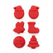 - Set da 6 stampini in silicone rosso con forme natalizie: Babbo Natale (2 varianti), campanella, calza, pallina e alberello con stella