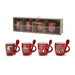 Materiale: ceramica smaltata, Capacità: 7 cl circa, Quantità: 4 tazzine + 4 cucchiaini, Motivo: natalizio, Colore principale: rosso con grafiche bianche, Confezione: scatola in cartone con finestrella, divisori e spago decorativo, Uso: caffè espresso, moka, tavola festiva, Regalo: pronta consegna e protezione durante trasporto