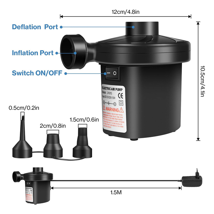 Function : Inflation and deflation - Power supply : AC 220-240V (household socket), DC 12V (car, cigarette lighter) - Power : 50W - Nozzles : 3 nozzles compatible for different types of inflatable items - Size : 12cm x 10cm x 8cm - Material : PA + PE (durable plastic) - Applications : Air mattresses, inflatable pools, water beds, swimming rings, camping items and more