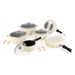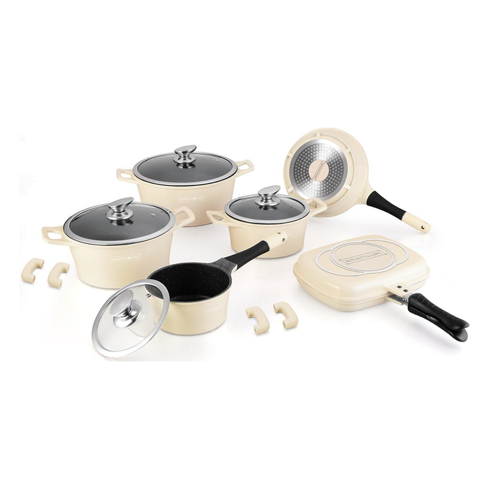 Materiale: Alluminio pressofuso con rivestimento in marmo - Colore: crema - Rivestimento: antiaderente effetto pietra lavica - Compatibilità: gas, elettrico, ceramica, alogeno, induzione - Contenuto: 1 padella 24x6,5cm con manico estraibile, 1 doppia bistecchiera, 4 manici in silicone removibili, 1 casseruola 24x14cm con coperchio in vetro temperato, 1 casseruola 28x14cm con coperchio in vetro temperato, 1 casseruola 20x10cm con coperchio in vetro temperato, 1 casseruola 16x8cm con manico e coperchio in vetro temperato