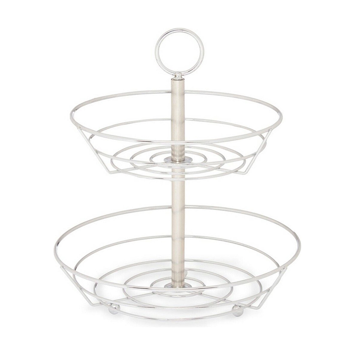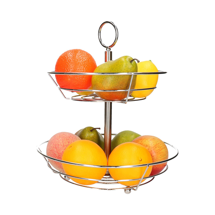 Modello: Fruttiera a 2 livelli – Materiale: Filo metallico cromato (ferro) – Colore: Argento / Silver – Diametro: 26 cm – Altezza: 30 cm – Peso: leggero e stabile – Lavabile in lavastoviglie: No – Fragile: No – Uso: da tavolo, cucina, dispensa – Caratteristiche: struttura aperta, manico integrato, ampia capacità