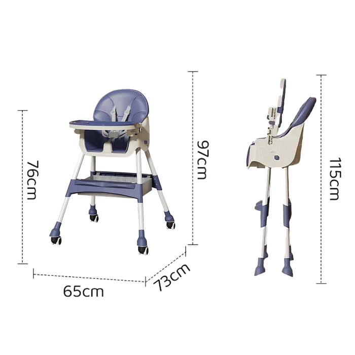 Materiale: PP + Acciaio | Dimensioni: 73 x 65 x 97 cm | Altezza regolabile | Vassoio a doppio strato regolabile (26-33 cm) | Cintura di sicurezza a 5 punti | Struttura triangolare rinforzata | Ruote silenziose con freni + Piedini antiscivolo | Rete portaoggetti inclusa | Colore: Neutro