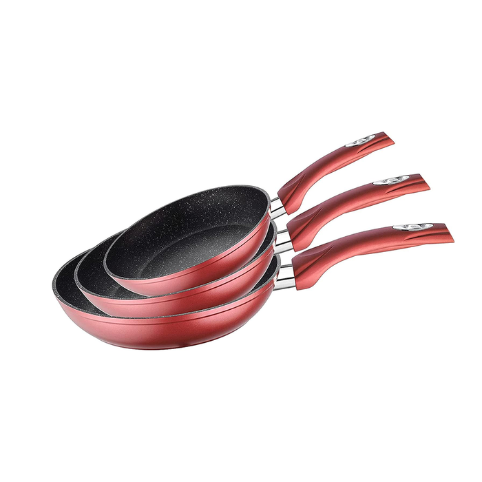 Set composto da: Padella 20 cm – Perfetta per uova, pancake e colazioni veloci. Padella 24 cm – Ideale per carne, verdure e frittate. Padella 28 cm – Perfetta per pasta, pesce e piatti più abbondanti. - Materiale: Alluminio pressofuso ultra resistenti - Struttura a 5 strati: 3 strati antiaderenti di alta qualità; Strato di alluminio pressofuso per una cottura uniforme; Strato esterno termoresistente e antiusura - Compatibilità: Induzione, gas, elettrico, ceramica, infrarossi - Pulizia: Lavabili in lavastoviglie, ma consigliato il lavaggio a mano per preservare il rivestimento - Impugnature: Ergonomiche e anticalore